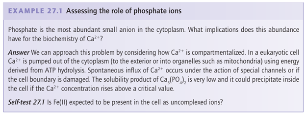 The selective uptake of metal ions has potential industrial applications, for many or-ganisms and organs are known to concentrate particular elements. Thus, liver cells are a good source of cobalamin2 (Co) and milk is rich in Ca. Certain bacteria accumulate Au and thus provide an unusual way for procuring this precious metal. Compartmentalization is an important factor in the design of metal complexes that are used in medicine (Sections 27.17–20). The very small size of bacteria and organelles raises an interesting point about scale, as species present at very low concentrations in very small regions may be represented by only a few individual atoms or molecules. For example, the cytoplasm in a bacterial cell of volume 10 15 dm3 at pH=6 will contain less than 1000 ‘free’ H ions. Indeed, any element nominally present at less than 1 nmol dm3 may be completely absent in individual cases. The word ‘free’ is significant, particularly for metal ions such as Zn2 that are high in the Irving–Williams series; even a eukaryotic cell with a total Zn concentration of 0.1 mmol dm3 may contain very few uncomplexed Zn2 ions.
