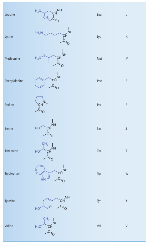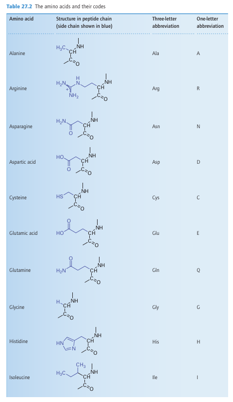 Key points: The major binding sites for metal ions are provided by the amino acids that make up protein molecules; the ligation sites range from backbone peptide carbonyls to the side chains that provide more specific complexation; nucleic acids and lipid head groups are usually coordinated to major metal ions. Metal ions coordinate to proteins, nucleic acids, lipids, and a variety of other molecules. For instance, ATP is a tetraprotic acid and is always found as its Mg2 complex (1); DNA is stabilized by weak coordination of K and Mg2 to its phosphate groups but destabilized by binding of soft metal ions such as Cu(I) to the bases. Macromolecules known as ribozymes may represent an important stage in the early evolution of life forms and are catalytic molecules composed of RNA and Mg2+. The binding of Mg+2 to phospholipid head groups is important for stabilizing membranes. There are a number of important small ligands, apart from water and free amino acids, which include sulfide, sulfate, carbonate, cyanide, carbon monoxide, and nitrogen monoxide, as well as organic acids such as citrate that form reasonably strong polydentate complexes with Fe (III). As will be familiar from introductory chemistry, a protein is a polymer with a specific sequence of amino acids linked by peptide bonds (2). A ‘small’ protein is generally regarded as one with molar mass below 20 kg mol 1, whereas a ‘large’ protein is one having a molar mass above 100 kg mol 1. The principal amino acids are listed in Table 27.2. Proteins are