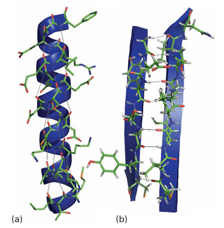 Figure 27.2 The most important regions of secondary structure, (a) helix, (b) sheet, showing hydrogen bonding between main-chain amide and carbonyl groups and their corresponding representations.