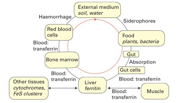 Figure 27.11 The biological Fe cycle showing how Fe is taken up from the external medium and guarded carefully in its travels through organisms.