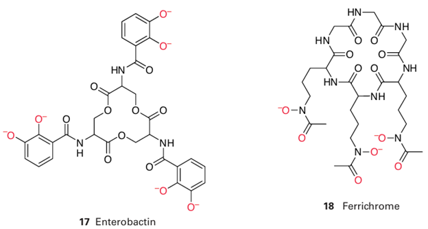 Siderophores are small polydentate ligands that have a very high affinity for Fe (III). They are secreted from many bacterial cells into the external medium, where they sequester Fe to give a soluble complex that re-enters the organism at a specific receptor. Once inside the cell, the Fe is released.