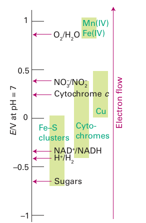 Key points: Electron flow along electron-transport chains is coupled to chemical processes such as ion (particularly H) transfer; the simplest electron-transfer centres have evolved to optimize fast electron transfer. In organisms, electrons are abstracted from food (fuel) and flow to an oxidant, down the potential gradient formed by the sequence of acceptors and donors known as a respiratory chain (Fig. 27.22).7 Apart from flavins and quinones, which are redox-active organic cofactors, these acceptors and donors are metal-containing electron transfer (ET) centres, which fall into three main classes, namely FeS clusters, cytochromes, and Cu sites. These enzymes are generally bound in a membrane, across which the energy from ET is used to sustain a transmembrane proton gradient: this is the basis of the chemiosmotic theory. The counterflow of H, through a rotating enzyme known as ATP synthase, drives the phosphorylation of ADP to ATP. Many membrane-bound redox enzymes are electrogenic proton pumps, which means they directly couple long-range ET to proton transfer through specific internal channels. We shall examine the properties of the three main types of ET centre. The same rules concerning outer-sphere electron-transfer that were discussed in Section 21.12 apply to metal centres in proteins, and we should note that organisms have optimized the structures and properties of these centres to achieve efficient long-range electron transfer. In the following discussion it will be useful to keep in mind that reduction potentials de pend on several factors (Section 5.10). Besides ionization energy and ligand environment (strong donors stabilize high oxidation states and lower the reduction potential; weak donors, π acceptors, and protons stabilize low oxidation states and raise the reduction potential), an active site in a protein is also influenced by the relative permittivity (which