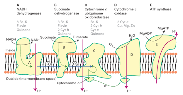 Figure 27.22 The mitochondrial respiratory electron transfer (ET) chain consists of several metalloenzyme molecules that use the energy of electron transport to transport protons across a membrane. The proton gradient is used to drive ATP synthesis. stabilizes centres with low overall charge), the presence of neighbouring charges, including those provided by other bound metal ions, and the availability of hydrogen-bonding interactions that will also stabilize reduced states. When we consider the kinetics of electron transfer, it will similarly be useful to keep in mind that ‘efficiency’ means that electron transfer is fast even when the reaction Gibbs energy is low and therefore that the reorganization energy of Marcus theory (Section 21.12) is low. This requirement is met by providing a ligand environment that does not alter significantly when an electron is added and by burying the site so that water molecules are excluded. Intersite distances are generally less than 1.4 nm in order to facilitate electron tunnelling, although it is still debated whether electron transfer in proteins depends mainly on distance alone or whether the protein can provide special pathways.