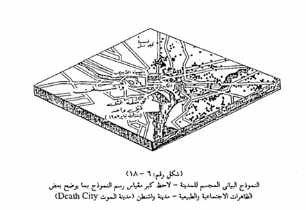 تستخدم الأشكال البيانية المجسمة في تمثيل المظاهر العمرانية في منطقة صغيرة (مدينة مثلا) ، وتحقق هذه الأشكال هدفين رأسيين أولهما أنها توضح استخدام الأرض المدني، وبصفة خاصة الاستخدام السكني، وشبكة الطرق والشوارع في المدينة، وثانيهما أنها تعطينا صورة للمنطقة بأبعادها الثلاثة -Three dimensional Picture كما أنه تسمح بتوزيع بعض الظواهر الاجتماعية عليها مثل ظاهرة القتل في المدينة ولا تهتم المجسمات بإظهار كل التفاصيل المعقدة للاستخدام المدني لسطح الأرض، ولكنها توضح فقط بعض الظاهرات العمرانية التى يهتم الدارسون بإبرازها وليس من الضروري أن تمثل هذه الظاهرات بمقياس رسم ثابت، بل يجب تحديد بعض التفاصيل وتقليل الحيز الذي تشغله والمبالغة فى مقياس رسمها حتى يتحقق التأثيرى المرئي Visual Impression المطلوب ويمثل سطح المجسم عادة كما يبدو للناظر من أعلى فالشكل رقم (6 - 18) يوضح مجسماً بفرض أن نقطة المراقبة التي يفترض أن أنه تمت منها عملية الرص تقع في مكان مرتفع وتتركز قيمة المجسم في المنطقة الوسطى منه وذلك لأنه قد يرسم إما من الخيال على أساس مشاهدة المنطقة أو معرفة وصف لها، وإما بالاستعانة بخريطة تفصيلية للمنطقة المطلوب عمل مجسم لها.