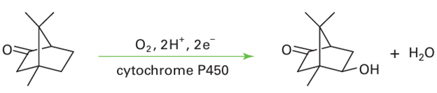 The Fe enzymes are divided into two main classes, haem and non-haem. We discuss the haem enzymes first, the most important type being cytochrome P450. Cytochrome P450 (or just P450) refers to an important and widely distributed group of haem-containing monooxygenases. In eukaryotes, they are localized particularly in mitochondria, and in higher animals they are concentrated in liver tissue. They play an essential role in biosynthesis (for example steroid transformations), such as the production of progesterone. The designation ‘P450’ arises from the intense absorption band that appears at 450 nm when solutions containing the enzyme or even crude tissue extracts are treated with a reducing agent and carbon monoxide, which produces the Fe (II) CO complex. Most P450s are complex membrane-bound enzymes that are difficult to isolate. Much of what we know about them stems from studies carried out with an enzyme P450cam, which is isolated from the bacterium Pseudomonas putida.