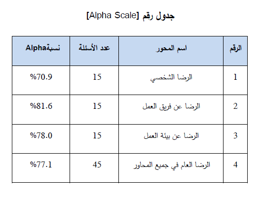 جاءت إحصائية (ألفا كرومباخ) لجميع أسئلة الاستبانة وفي كافة المراحل تفوق (67%) مما يعطي تطمينات أنّ أداة الدراسة المستخدمة لرصد الظاهرة هي ثابتة وصادقة ويمكن الاعتماد على البيانات المجمعة بواسطتها.