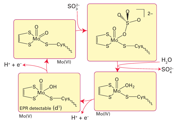 Figure 27.43 Oxidation of sulfite to sulfate by sulfite oxidase, illustrating the direct O-atom transfer mechanism for Mo enzymes.