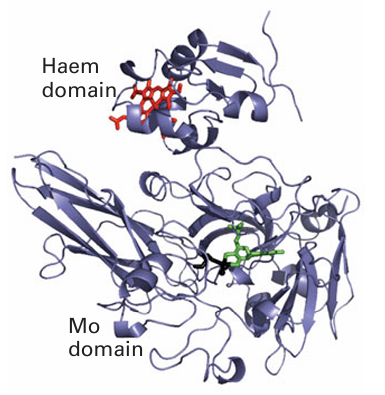 Figure 27.44 Structure of sulfite oxidase showing the Mo and haem domains. The region of polypeptide linking the two domains is highly mobile and is not resolved by crystallography.