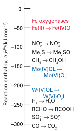 Figure 27.45 Scale showing relative enthalpies for O-atom transfer. Fe (IV) oxido species are powerful O-atom donors, whereas Mo(IV) and W(IV) are good O-atom acceptors.