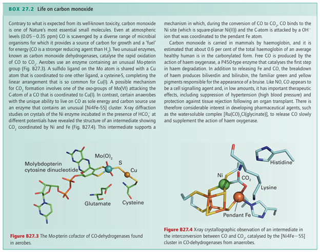 Microbial oxidation of CO to CO2 is important for removing more than 100 Mt of this toxic gas from the atmosphere every year. As shown in Box 27.2, this reaction is carried out by enzymes that contain either a Mo-pterin/Cu cofactor or an air-sensitive [Ni 4Fe 5S] cluster.