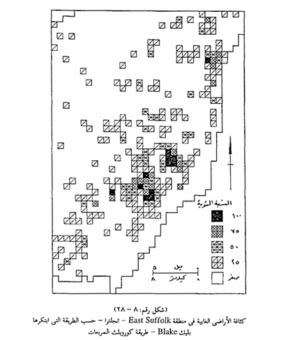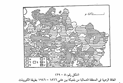 بواسطة جهاز البلانيمتر أو بالطريقة التخطيطية (طريقة المربعات) حسب ما يسمح به مقياس رسم الخريطة وبعد ذلك نوقع عدد الوحدات الحيوانية في كل وحدة إدارية في جدول يقدر منه الطاقة الرعوية لكل كيلو متر مربع من الأرض الرعوية في كل وحدة إدارية. فمثلاً إذا كانت الطاقة الرعوية في وحدة إدارية ما وحدات حيوانية للكيلو متر المربع، وكانت مساحة المنطقة الرعوية في هذه الوحدة الإدارية 20 كيلو متر مربع، فمعنى هذا أن الطاقة الرعوية لهذه الوحدة الإدارية تستطيع أن تستوعب عدداً مثالياً من الوحدات الحيوانات قدره 160 وحدة حيوانية ثم نقوم بعد ذلك بحساب الانحراف بين العدد المثالي أي العدد المفروض أن يكون في الوحدة الإدارية وبين العدد الحقيقي من الوحدات الحيوانية الموجود بالفعل فى الوحدة الإدارية، ثم ينسب هذا الانحراف إلى العدد المثالي للوحدات الحيوانية فى هذه الوحدة الإدارية لنحصل على النسبة المئوية للانحراف سواء كانت بالسالب أو بالموجب وتطبق نفس الاجراءات في بقية الوحدات الإدارية الأخرى، وفى النهاية توقع قيم النسب المئوية داخل مساحة الوحدات الإدارية على الخريطة، ونختار لها نظاماً مناسباً من التظليل المتدرج، الذي يتضمن تظليلاً للنسب السالبة يكون بنمط النقط، وتظليلاً للنسب الموجبة ويكون بنمط خطوط التظليل، وتترك المناطق المثالية فى طاقتها الرعوية خالية من أي نوع من التظليل. والشكل رقم (8) - (29) يوضح نوعاً من الخرائط التي تبين الطاقة الرعوية فى المنطقة الشمالية من بلجيكا، ويظهر على الخريطة المناطق غير المتطورة رعوياً والتي يمكن أن تستوعب المزيد من حيوانات الرعي، والمناطق التي تتميز بالرعي الجائر والتي تتحمل أكثر من طاقتها الرعوية، بالإضافة إلى المناطق المثالية في طاقتها الرعوية أي المناطق التي يتماثل فيها العدد المفروض من الوحدات الحيوانية مع العدد الحقيقي الموجود بها ومثل هذه الخريطة تعتبر مصدراً هاماً للبيانات وأداة مفيدة تعين متخذي القرار في هيئات التخطيط المهتمة بشؤون تنمية المراعي والثروة الحيوانية.