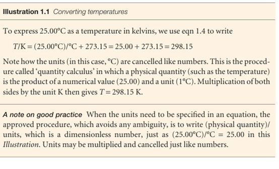 The Zeroth Law justifies the concept of temperature and the use of a thermometer, a device for measuring the temperature. Thus, suppose that B is a glass capillary containing a liquid, such as mercury, that expands significantly as the temperature increases. Then, when A is in contact with B, the mercury column in the latter has a certain length. According to the Zeroth Law, if the mercury column in B has the same length when it is placed in thermal contact with another object C, then we can predict that no change of state of A and C will occur when they are in thermal contact. More-over, we can use the length of the mercury column as a measure of the temperatures of A and C. In the early days of thermometry (and still in laboratory practice today), tempera tures were related to the length of a column of liquid, and the difference in lengths shown when the thermometer was first in contact with melting ice and then with boiling water was divided into 100 steps called ‘degrees’, the lower point being labelled 0. This procedure led to the Celsius scale of temperature. In this text, temperatures on the Celsius scale are denoted θ and expressed in degrees Celsius (°C). However, because different liquids expand to different extents, and do not always expand uniformly over a given range, thermometers constructed from different materials showed different numerical values of the temperature between their fixed points. The pressure of a gas, however, can be used to construct a perfect-gas temperature scale that is independent of the identity of the gas. The perfect-gas scale turns out to be identical to the thermodynamic temperature scale to be introduced in Section 3.2c, so we shall use the latter term from now on to avoid a proliferation of names. On the thermodynamic temperature scale, temperatures are denoted T and are normally reported in kelvins, K (not °K). Thermodynamic and Celsius temperatures are related by the exact expression