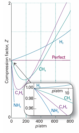 Fig. 1.16 The compression factor, Z, approaches 1 at low pressures, but does so with different slopes. For a perfect gas, the slope is zero, but real gases may have either positive or negative slopes, and the slope may vary with temperature. At the Boyle temperature, the slope is zero and the gas behaves perfectly over a wider range of conditions than at other temperatures.