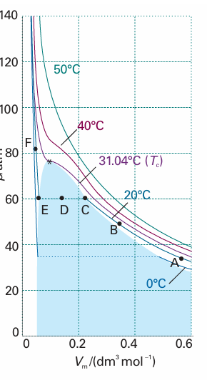 Figure 1.15 shows the experimental isotherms for carbon dioxide. At large molar volumes and high temperatures the real-gas isotherms do not differ greatly from perfect-gas isotherms. The small differences suggest that the perfect gas law is in fact the first term in an expression of the form , pVm=RT (1 + B′p +C′p2+ ···)                                      (1.18)