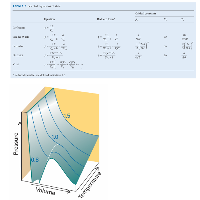 We now examine to what extent the van der Waals equation predicts the behaviour of real gases. It is too optimistic to expect a single, simple expression to be the true equation of state of all substances, and accurate work on gases must resort to the virial equation, use tabulated values of the coefficients at various temperatures, and analyse the systems numerically. The advantage of the van der Waals equation, however, is that it is analytical (that is, expressed symbolically) and allows us to draw some general conclusions about real gases. When the equation fails we must use one of the other equations of state that have been proposed (some are listed in Table 1.7), invent a new one, or go back to the virial equation. That having been said, we can begin to judge the reliability of the equation by com paring the isotherms it predicts with the experimental isotherms in Fig. 1.15. Some