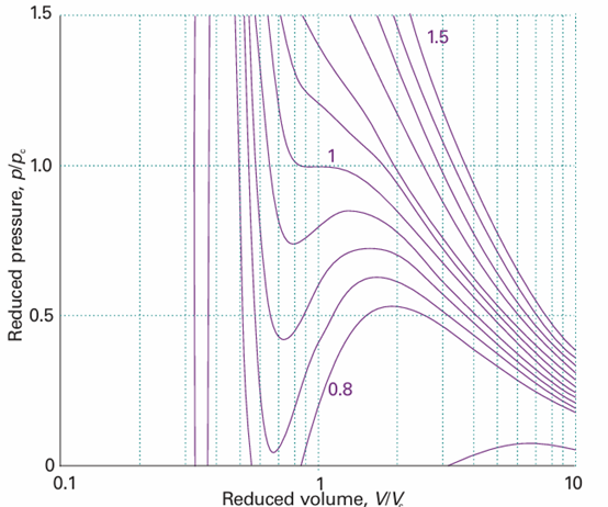 Fig. 1.18 Van der Waals isotherms at several values of T/Tc. Compare these curves with those in Fig. 1.15. The van der Waals loops are normally replaced by horizontal straight lines. The critical isotherm is the isotherm for T/Tc = 1. Exploration Calculate the molar volume of chlorine gas on the basis of the van der Waals equation of state at 250 K and 150 kPa and calculate the percentage difference from the value predicted by the perfect gas equation. calculated isotherms are shown in Figs. 1.17 and 1.18. Apart from the oscillations below the critical temperature, they do resemble experimental isotherms quite well. The oscillations, the van der Waals loops, are unrealistic because they suggest that under some conditions an increase of pressure results in an increase of volume. Therefore, they are replaced by horizontal lines drawn so the loops define equal areas above and below the lines: this procedure is called the Maxwell construction (3). The van der Waals coefficients, such as those in Table 1.7, are found by fitting the calcu lated curves to the experimental curves.