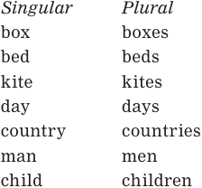 These words all already end in sounds (again, not letters) that are either [s] or [z] or sounds very similar to them. They are all ‘‘noisy’’ sounds. For the plural forms of these words, we add a vowel sound (written with the letter e) followed by a [z] sound (but written with the letter s): glasses, mazes, wishes, garages, churches, judges. If you think about it, pronouncing a vowel between the noisy sound at the end of the noun and the noisy sound [z] of the plural makes sense: without that vowel, we would have two noisy sounds in a row, something that would be harder for the listener to hear clearly.