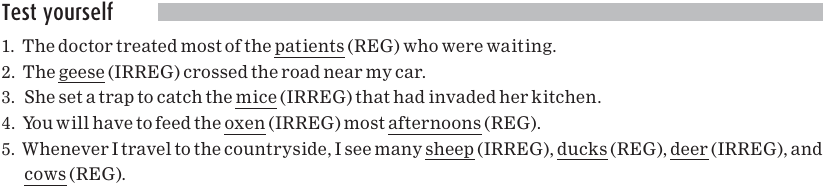 Usually, we pluralize a noun by adding an ‘‘s’’ to it, as in books; these nouns are called regular. There are a handful of nouns that are pluralized in other ways; these nouns are called irregular.