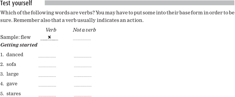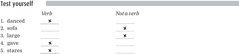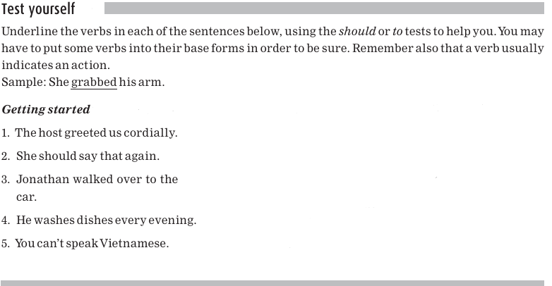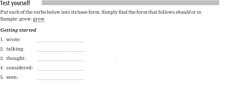 You certainly can’t say, *John should studied, or John to studied, so how do we know that studied is a verb? To test the word, you have to see if it can follow should or to in a different form, not necessarily in the form that you see in a particular sentence. For example, if you see John studied, ask yourself if there’s a different form of studied that can follow should or to. In this case there is: John should study or John decided to study. So, study and all its forms are verbs. The form of the verb that follows should or to is called the base form or infinitive form. The term infinitive is used to refer either to the base form alone (for example, study), or to the to+ base form (for example, to study).