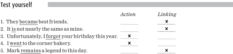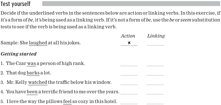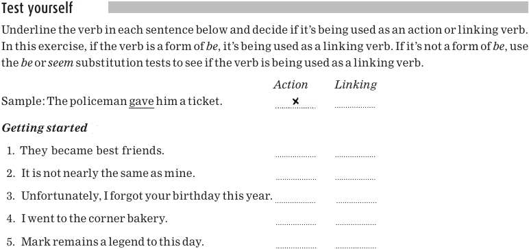 Thus, became, look, and remains are being used as linking verbs in these sentences. Remember that be and its forms can also be used as linking verbs. While the Quick tip below isn’t foolproof, it will usually help you identify whether a verb is an action or linking verb.