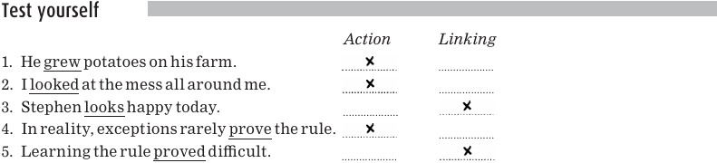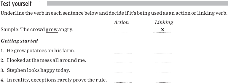 Can you sense the difference? In sentence 31a the verb looked is a linking verb, followed by the adjective careful; the basic meaning of the sentence is She looked like she was a careful person. In contrast, in sentence 31b looked is an action verb, followed by the adverb carefully; the basic meaning of this sentence is She looked around in a careful manner. Quick tip identifies yet another difference between linking verbs and action verbs.