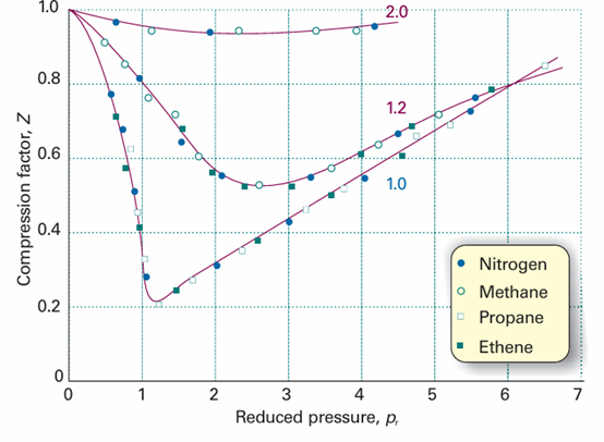 Fig. 1.19The compression factors of four of the gases shown in Fig. 1.14 plotted using reduced variables. The curves are labelled with the reduced temperature Tr=T/Tc. The use of reduced variables organizes the data on to single curves. Exploration Is there a set of conditions at which the compression factor of a van der Waals gas passes through a minimum? If so, how does the location and value of the minimum value of Z depend on the coefficients a and b?