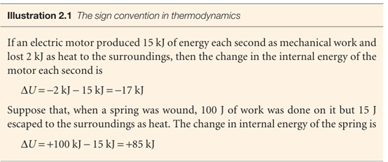In thermodynamics, the total energy of a system is called its internal energy, U. The internal energy is the total kinetic and potential energy of the molecules in the system (see Comment 1.3for the definitions of kinetic and potential energy).1We denote by ∆Uthe change in internal energy when a system changes from an initial state i with internal energy Ui to a final state f of internal energy , Uf: ∆U=Uf−Ui , The internal energy is a state function in the sense that its value depends only on the current state of the system and is independent of how that state has been prepared. In other words, it is a function of the properties that determine the current state of the system. Changing any one of the state variables, such as the pressure, results in a change in internal energy. The internal energy is an extensive property. That the internal energy is a state function has consequences of the greatest importance, as we start to unfold in Section 2.10. Internal energy, heat, and work are all measured in the same units, the joule (J). The joule, which is named after the nineteenth-century scientist J.P. Joule, is defined as 1 J = 1 kg m2 s−2 , A joule is quite a small unit of energy: for instance, each beat of the human heart consumes about 1 J. Changes in molar internal energy, ∆Um, are typically expressed in kilojoules per mole (kJ mol−1). Certain other energy units are also used, but are more common in fields other than thermodynamics. Thus, 1 electronvolt (1 eV) is defined as the kinetic energy acquired when an electron is accelerated from rest through a potential difference of 1 V; the relation between electronvolts and joules is 1 eV ≈ 0.16 aJ (where 1 aJ = 10−18 J). Many processes in chemistry have an energy of several electronvolts. Thus, the energy to remove an electron from a sodium atom is close to 5 eV. Calories (cal) and kilocalories (kcal) are still encountered. The current definition of the calorie in terms of joules is