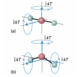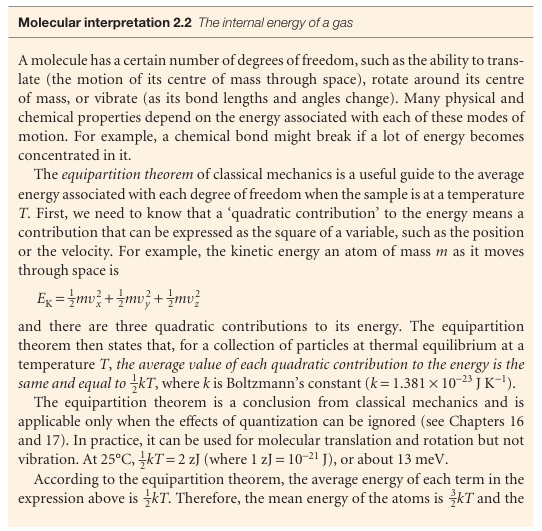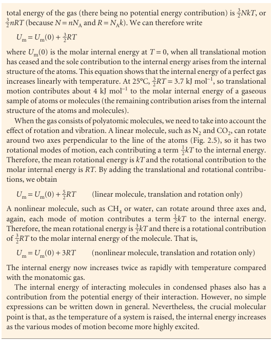 Fig. 2.5The rotational modes of molecules and the corresponding average energies at a temperature T. (a) A linear molecule can rotate about two axes perpendicular to the line of the atoms. (b) A nonlinear molecule can rotate about three perpendicular axes. It has been found experimentally that the internal energy of a system may be changed either by doing work on the system or by heating it. Whereas we may know how the energy transfer has occurred (because we can see if a weight has been raised or lowered in the surroundings, indicating transfer of energy by doing work, or if ice has melted in the surroundings, indicating transfer of energy as heat), the system is blind to the mode employed. Heat and work are equivalent ways of changing a system’s internal energy. A system is like a bank: it accepts deposits in either currency, but stores its reserves as internal energy. It is also found experimentally that, if a system is isolated from its surroundings, then no change in internal energy takes place. This summary of observations is now known as the First Law of thermodynamics and expressed as follows: The internal energy of an isolated system is constant. We cannot use a system to do work, leave it isolated for a month, and then come back expecting to find it restored to its original state and ready to do the same work again. The evidence for this property is that no ‘perpetual motion machine’ (a machine that does work without consuming fuel or some other source of energy) has ever been built. These remarks may be summarized as follows. If we write w for the work done on a system, q for the energy transferred as heat to a system, and ∆U for the resulting change in internal energy, then it follows that ∆U= q+w (2.2) , Equation 2.2 is the mathematical statement of the First Law, for it summarizes the equivalence of heat and work and the fact that the internal energy is constant in an isolated system (for which q = 0 and w = 0). The equation states that the change in internal energy of a closed system is equal to the energy that passes through its bound ary as heat or work. It employs the ‘acquisitive convention’, in which w > 0 or q > 0 if energy is transferred to the system as work or heat and w < 0 or q < 0 if energy is lost from the system as work or heat. In other words, we view the flow of energy as work or heat from the system’s perspective.