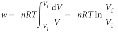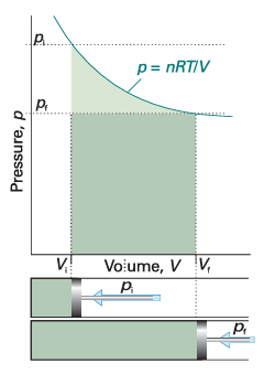 Consider the isothermal, reversible expansion of a perfect gas. The expansion is made isothermal by keeping the system in thermal contact with its surroundings (which may be a constant-temperature bath). Because the equation of state is pV = nRT, we know that at each stage p = nRT/V, with V the volume at that stage of the expansion. The temperature T is constant in an isothermal expansion, so (together with n and R) it may be taken outside the integral. It follows that the work of reversible isothermal expansion of a perfect gas from Vi to Vf at a temperature T is