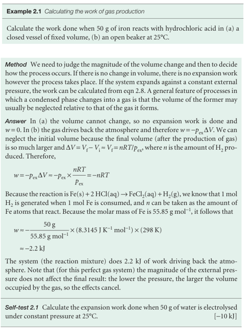 When the final volume is greater than the initial volume, as in an expansion, the logarithm in eqn 2.11 is positive and hence w < 0. In this case, the system has done work on the surroundings and the internal energy of the system has decreased as a result.2 The equations also show that more work is done for a given change of volume when the temperature is increased. The greater pressure of the confined gas then needs a higher opposing pressure to ensure reversibility. We can express the result of the calculation as an indicator diagram, for the magnitude of the work done is equal to the area under the isotherm p = nRT/V (Fig. 2.8). Superimposed on the diagram is the rectangular area obtained for irreversible expansion against constant external pressure fixed at the same final value as that reached in the reversible expansion. More work is obtained when the expansion is reversible (the area is greater) because matching the external pressure to the internal pressure at each stage of the process ensures that none of the system’s pushing power is wasted. We cannot obtain more work than for the reversible process because increasing the external pressure even infinitesimally at any stage results in compression. We may infer from this discussion that, because some pushing power is wasted when p > pex, the maxi mum work available from a system operating between specified initial and final states and passing along a specified path is obtained when the change takes place reversibly. We have introduced the connection between reversibility and maximum work for the special case of a perfect gas undergoing expansion. Later (in Section 3.5) we shall see that it applies to all substances and to all kinds of work.