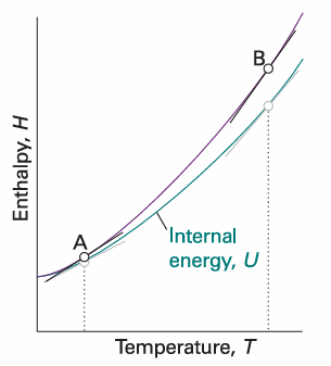 Fig. 2.14 The slope of the tangent to a curve of the enthalpy of a system subjected to a constant pressure plotted against temperature is the constant-pressure heat capacity. The slope may change with temperature, in which case the heat capacity varies with temperature. Thus, the heat capacities at A and B are different. For gases, at a given temperature the slope of enthalpy versus temperature is steeper than that of internal energy versus temperature, and Cp,m is larger than CV, m.