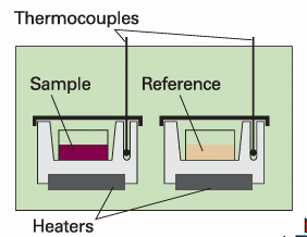 Fig. 2.15 A differential scanning calorimeter. The sample and a reference material are heated in separate but identical metal heat sinks. The output is the difference in power needed to maintain the heat sinks at equal temperatures as the temperature rises.
