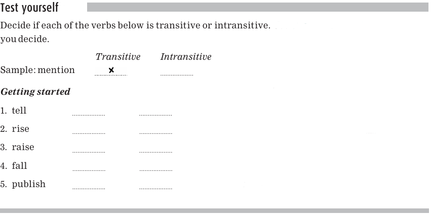 Thus, you can see that there are two kinds of verbs. One kind, such as write, annoy, and throw, acts upon something. The noun (or noun phrase; see The basic structure of noun phrases) that the verb acts up on is called the direct object of the sentence. (You’ll learn more about direct objects in Direct objects.) Those verbs that act on something are called transitive verbs. Typically, in statements, a transitive verb is followed by the noun (or noun phrase) that it is acting upon.
