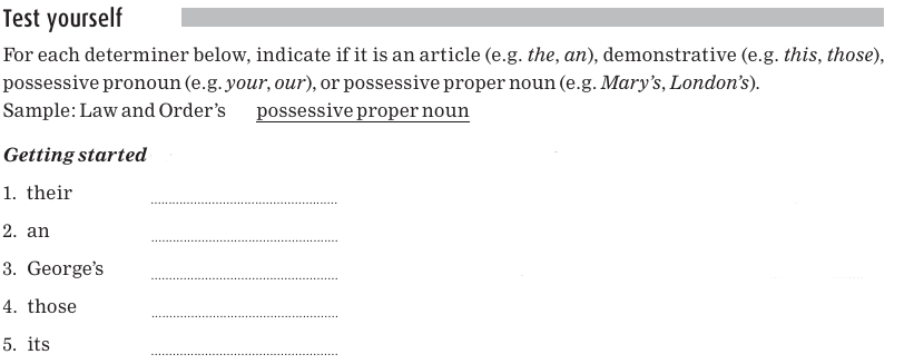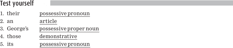 The possessive in sentence 1 is called a possessive pronoun; the possessive in sentence 2 is called a possessive proper noun. Notice that, just like articles and demonstratives, possessive pronouns and possessive proper nouns can appear directly before a noun. We’ll discuss each of these separately.