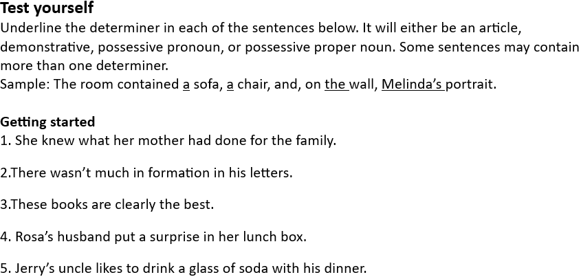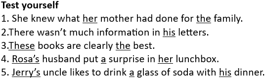 The determiner possessive pronouns are: my, your, his, her, its, our, their.