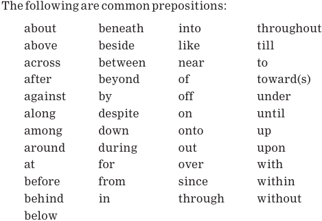 Prepositions are words, usually small, that typically indicate information about direction, location, or time. There is only a small number of prepositions in English. Some commonly used examples are at, from, in, on, and to.
