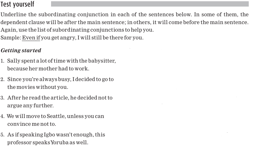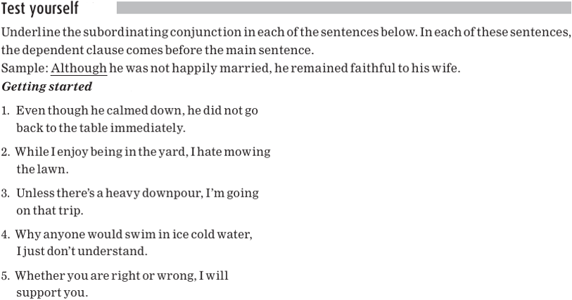 In all of the examples we’ve looked at so far, the dependent clause has come after the main sentence. But sometimes the dependent clause comes before the main sentence. In the following examples, the subordinating conjunctions are underlined, and the main sentences are in bold: