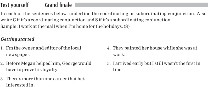 Subordinating conjunctions connect sentences; however, the two parts that are connected are not of equal value in terms of the meaning of the whole sentence. There is a main sentence with a subpart; the subordinating conjunction connects the subpart to the main sentence. Here are sentences 1 through 5 again, but this time with the main sentences in bold.