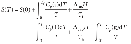 The entropy of a system at a temperature T is related to its entropy at T = 0 by measuring its heat capacity Cp at different temperatures and evaluating the integral in eqn 3.18, taking care to add the entropy of transition (∆trsH/Ttrs) for each phase transition between T =0 and the temperature of interest. For example, if a substance melts at Tf and boils at Tb, then its entropy above its boiling temperature is given by