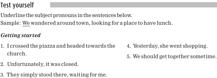 Notice that in each sentence pair, the underlined pronoun replaces the underlined noun. The underlined noun is doing the action in the sentence and comes before the verb. This kind of noun is called the subject of the sentence and the pronoun that replaces it is called a subject pronoun.