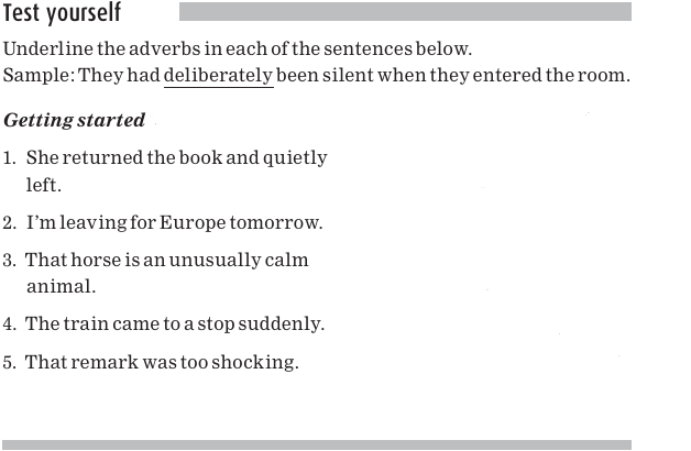Adverbs generally indicate information about location, time, degree, and manner. They provide extra information about the action in a sentence, about adjectives and about other adverbs.