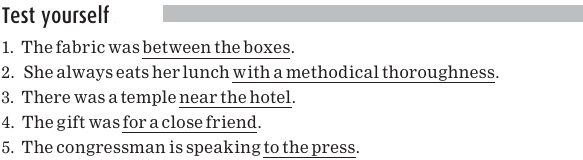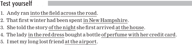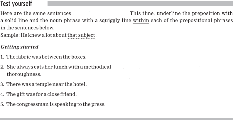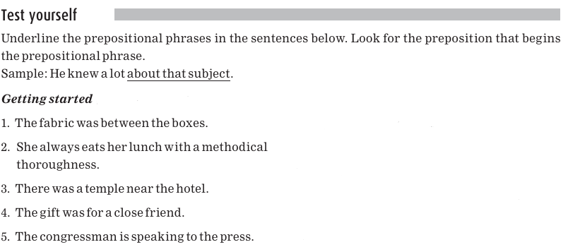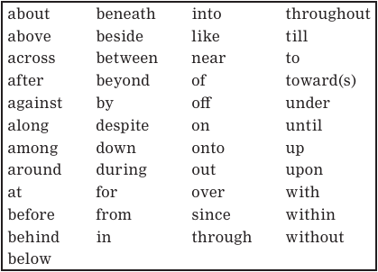 Each of these sentences contains a preposition, which is underlined. Here again are the common prepositions: