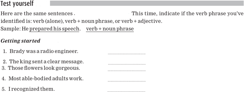 Have you noticed anything that all the underlined verb phrases in sentences 1-5 have in common? Each verb phrase has a verb. In fact, in sentence 1, the verb phrase has nothing in it but a verb, left. A verb phrase may also have other words, as you can see in sentences 2-5, but the least that every verb phrase has to have is a verb.