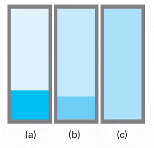 Fig. 4.3 (a) A liquid in equilibrium with its vapour. (b) When a liquid is heated in a sealed container, the density of the vapour phase increases and that of the liquid decreases slightly. There comes a stage, (c), at which the two densities are equal and the interface between the fluids disappears. This disappearance occurs at the critical temperature. The container needs to be strong: the critical temperature of water is 374°C and the vapour pressure is then 218 atm.