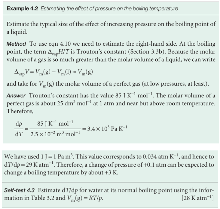 Because the molar volume of a gas is so much greater than the molar volume of a liquid, we can write ∆vapV ≈ Vm(g) (as in Example 4.2). Moreover, if the gas behaves perfectly, Vm(g) = RT/p. These two approximations turn the exact Clapeyron equation into