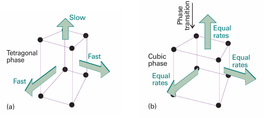 Fig. 4.18One version of a second-order phase transition in which (a) a tetragonal phase expands more rapidly in two directions than a third, and hence becomes a cubic phase, which (b) expands uniformly in three directions as the temperature is raised. There is no rearrangement of atoms at the transition temperature, and hence no enthalpy of transition.