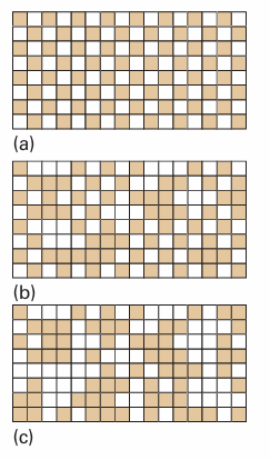 Fig. 4.19An order–disorder transition. (a) At T=0, there is perfect order, with different kinds of atoms occupying alternate sites. (b) As the temperature is increased, atoms exchange locations and islands of each kind of atom form in regions of the solid. Some of the original order survives. (c) At and above the transition temperature, the islands occur at random throughout the sample.