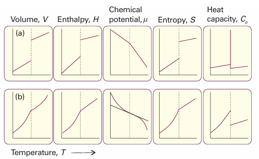 Fig. 4.16 The changes in thermodynamic properties accompanying (a) first-order and (b) second-order phase transitions.