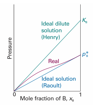 Fig. 5.15 When a component (the solvent) is nearly pure, it has a vapour pressure that is proportional to mole fraction with a slope pB * (Raoult’s law). When it is the minor component (the solute) its vapour pressure is still proportional to the mole fraction, but the constant of proportionality is now KB (Henry’s law).