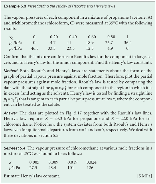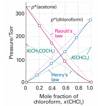 Fig. 5.17The experimental partial vapour pressures of a mixture of chloroform (trichloromethane) and acetone (propanone) based on the data in Example 5.3. The values of Kare obtained by extrapolating the dilute solution vapour pressures as explained in the Example.
